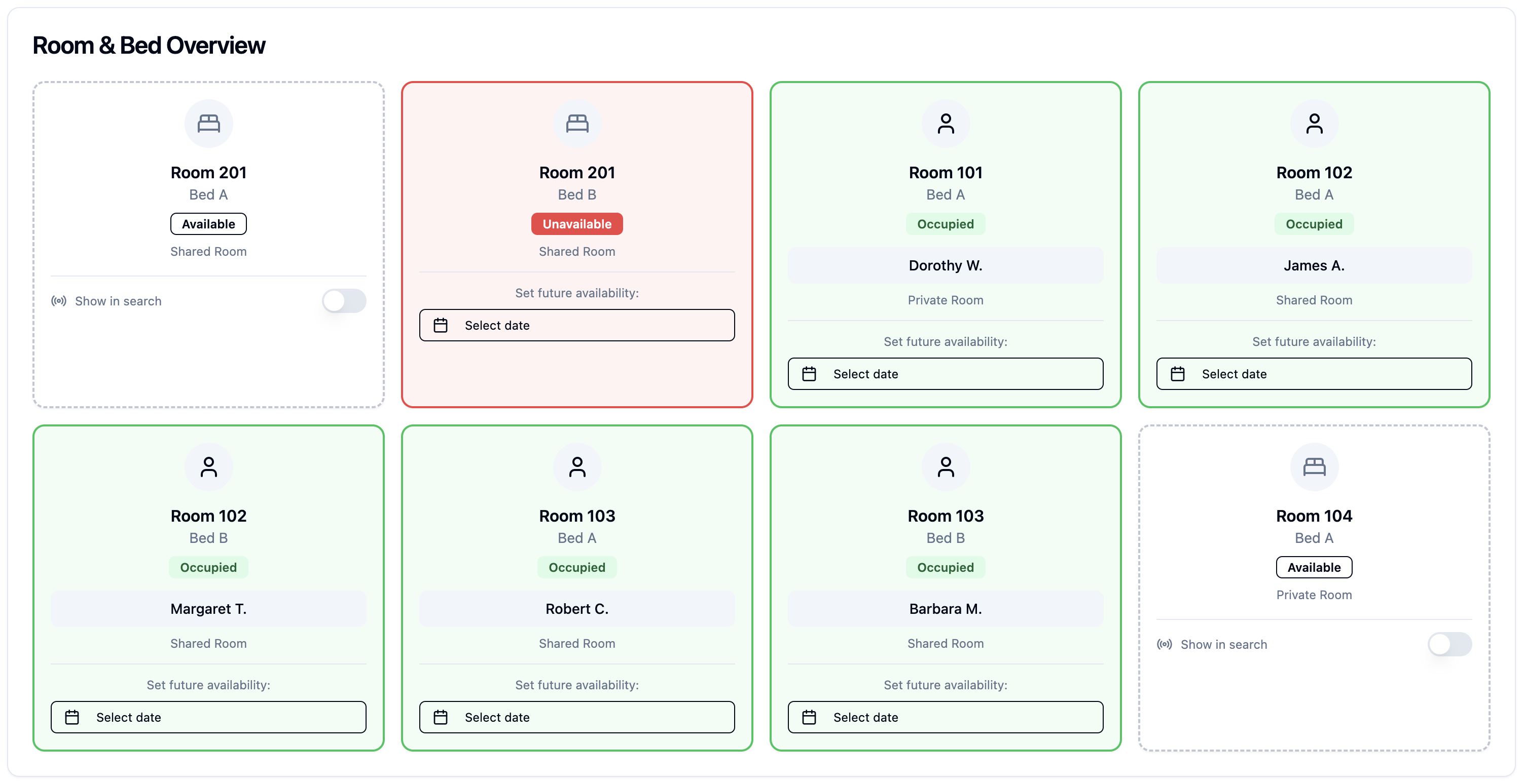 See which beds are occupied, available, or under maintenance at a glance.
